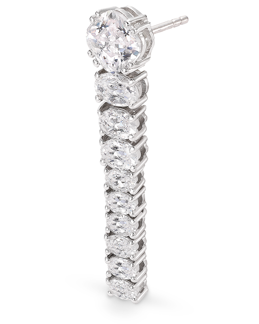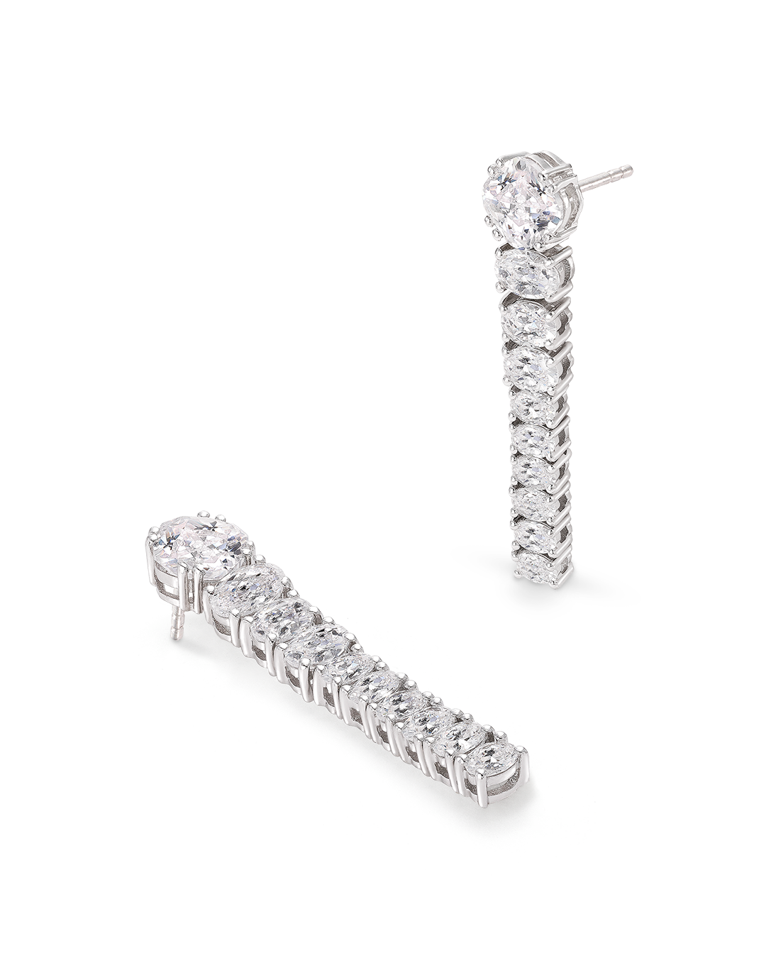 Pendientes largos con circonita talla oval en plata de ley con baño de rodio.